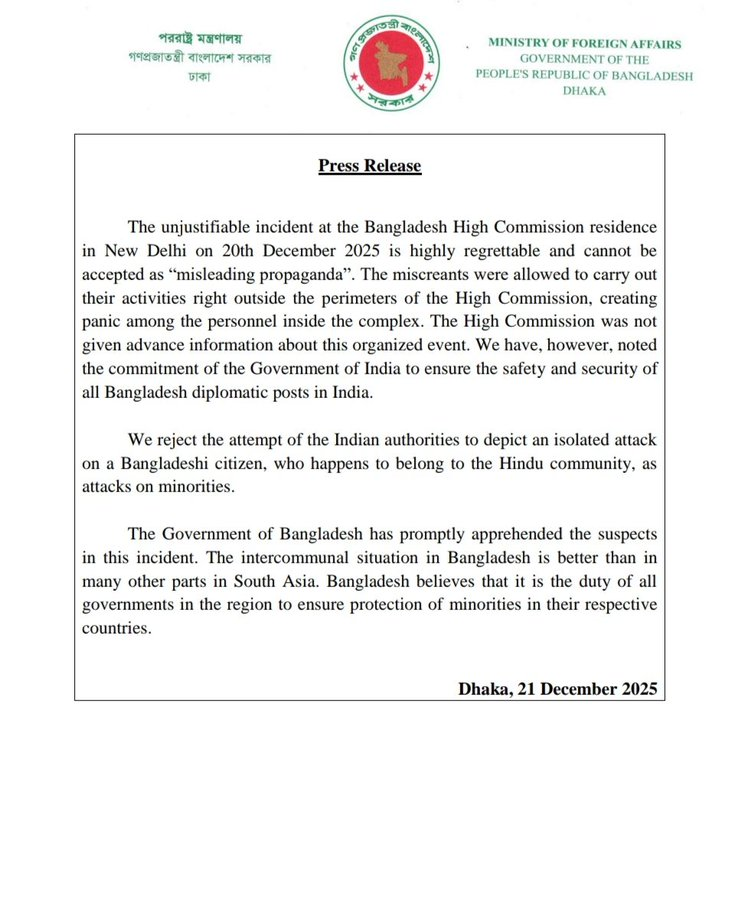 ढाका / नई दिल्ली: भारत और बांग्लादेश के बीच कूटनीतिक संबंधों के संदर्भ में एक अहम घटनाक्रम सामने आया है। ने 21 दिसंबर 2025 को एक आधिकारिक प्रेस विज्ञप्ति जारी कर नई दिल्ली स्थित के आवास के बाहर हुई घटना पर गहरी चिंता और नाराज़गी व्यक्त की है। यह घटना 20 दिसंबर 2025 को हुई बताई गई है, जिसे बांग्लादेश ने “अनुचित, दुर्भाग्यपूर्ण और भ्रामक प्रचार से जोड़ने योग्य नहीं” बताया है।